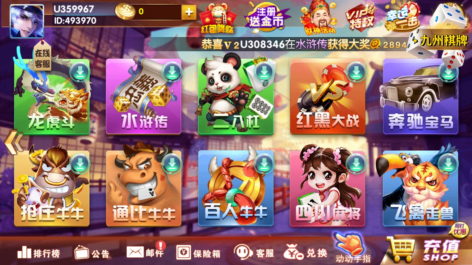 九州棋牌多种多样,有麻将、鬭地主、牛牛、跑得快等等多种游戯,让玩家可以享受到更多的乐趣!