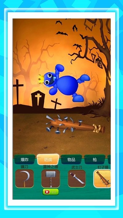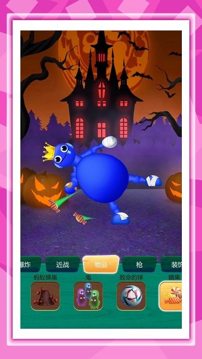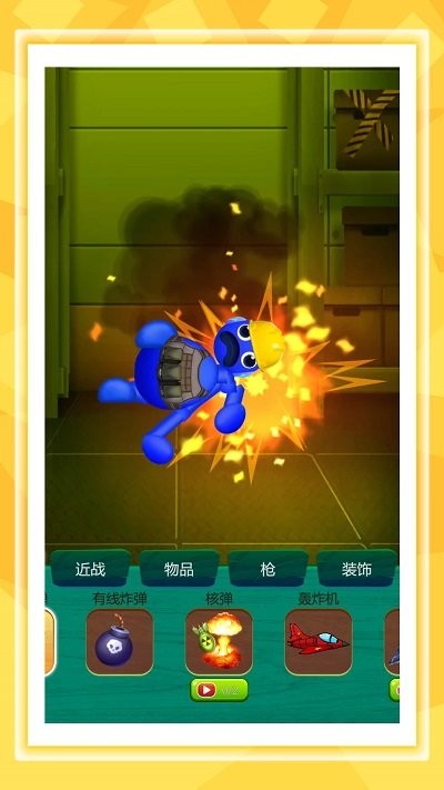 4、瞧战斗操作页,点底部爆炸选项,看榴弹等道具,画面中有蓝色球角色发射棕色炮弹。